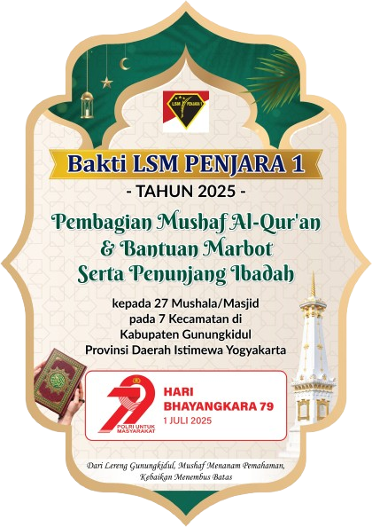 Jakarta — Dalam rangka menyambut Hari Bhayangkara ke-79, LSM PENJARA 1 kembali meneguhkan komitmennya dalam pengabdian sosial dan spiritual kepada masyarakat akar rumput. Melalui kegiatan bertajuk “Bakti LSM PENJARA 1 Tahun 2025”, lembaga ini akan melaksanakan pendistribusian Mushaf Al-Qur’an, bantuan Marbot (Modin), termasuk pengadaan mesin pompa air pada 27 mushala/masjid yang tersebar di 9 kecamatan wilayah Kabupaten Gunungkidul, Daerah Istimewa Yogyakarta.