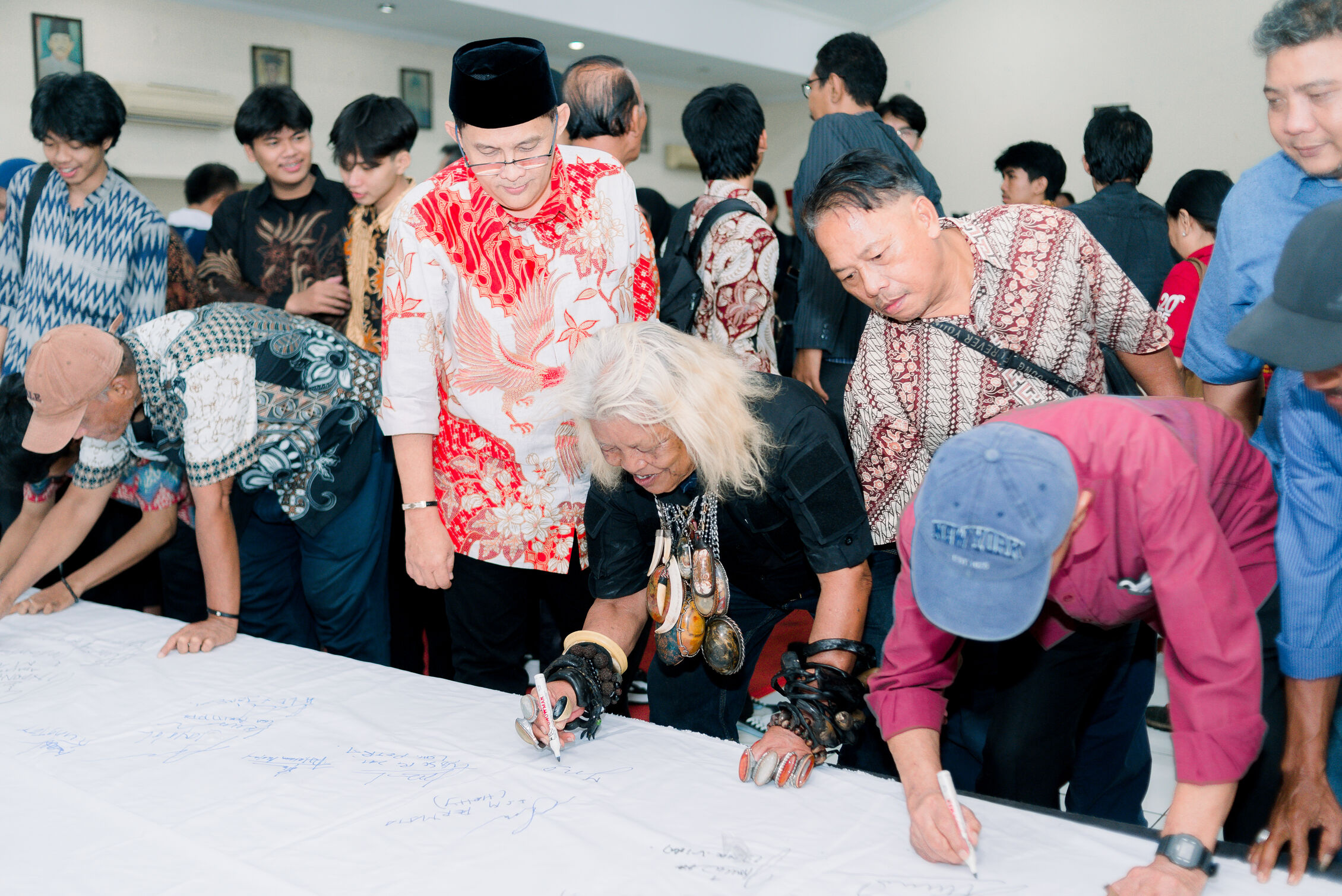 Usai pembacaan, seluruh tokoh dan peserta menorehkan tanda tangan serta menuliskan pesan kebangsaan di atas bentangan kain putih. Prosesi ini menjadi simbol kokoh bahwa persatuan bukan hanya retorika, melainkan tekad bersama untuk menjaga persaudaraan, merawat kebinekaan, menolak korupsi, dan menyalakan lentera persatuan menuju Indonesia Emas 2045 yang damai, adil, dan berdaulat.